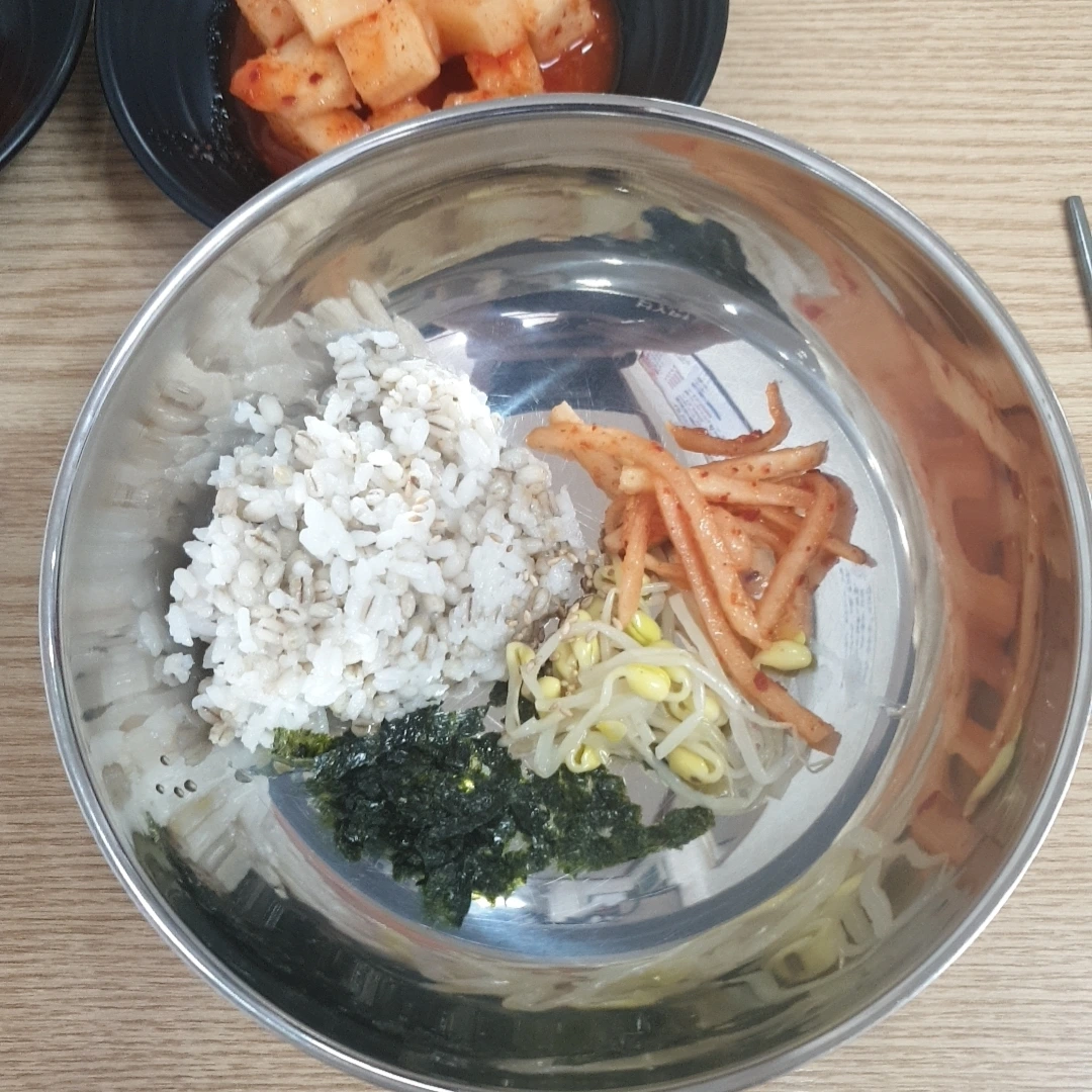 평소 작은 성량에 소리가 잘 들릴 것 같지 않아 마스크를 살짝 들어 불고기 칼국수 하나 부탁드려요 하고 내뱉었다. 기대감이 일으킨 허기짐이 밀려올 때쯤 머리가 희끗하신 사장님이 보리밥 비빔밥 한 공기를 내어주었다. 무채와 김가루에 보리 밥한 덩이가 참 복스럽게 눈길을 사로잡았다. 빨간 고추장을 살짝 들에 휙휙 저어 한 숟가락 한 숟가락 반복을 했다. 입안에서의 음식들이 아는 맛이지만 반갑고 정겨운 느낌이다.
