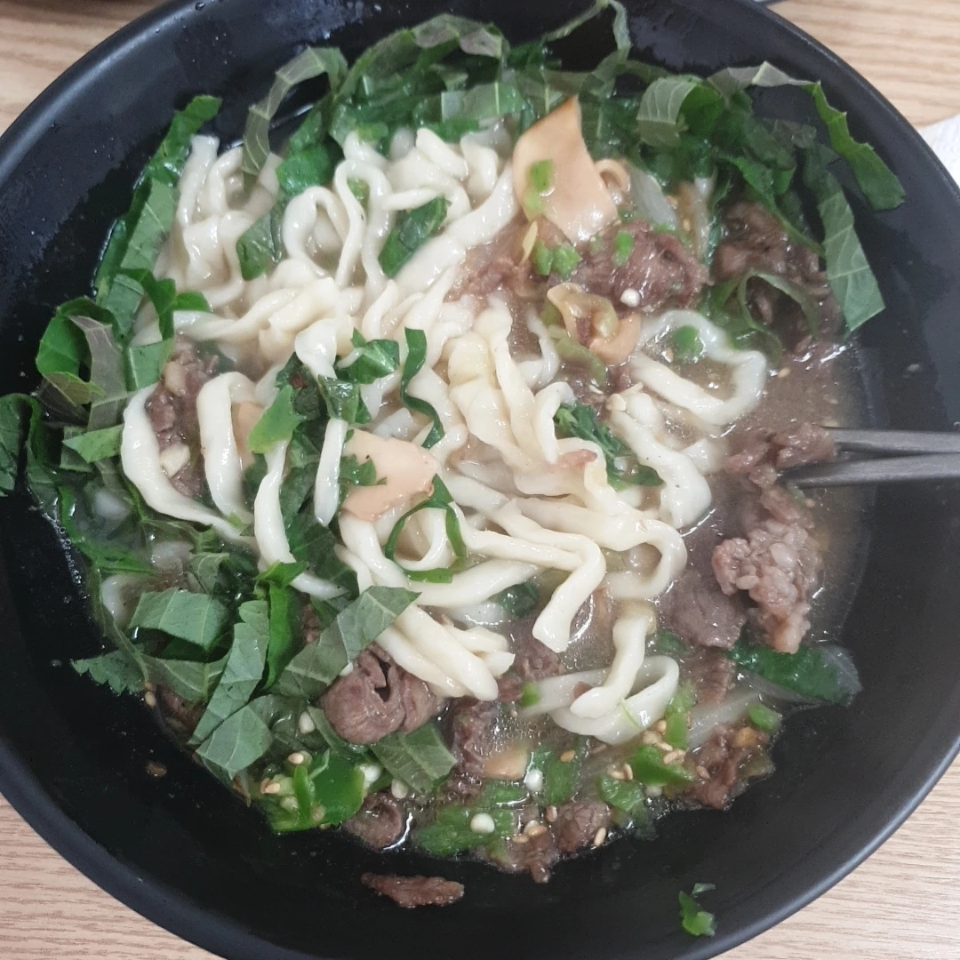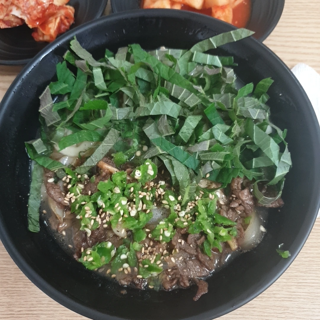 면 위로 깻잎들이 잘게 잘려있고 한가운데 불고기들이 수북이 쌓여있었다. 젓가락으로 불고기한점을 집어먹었다. 맛있다. 다시 수저를 들어 아래 면들을 건져내었다. 다시 먹어도 맛있다. 뜨끈한 국물 사이로 매콤한이 느껴진다. 단짠의 조화와 살포시 느껴지는 매운 맛이 참 재미나다.