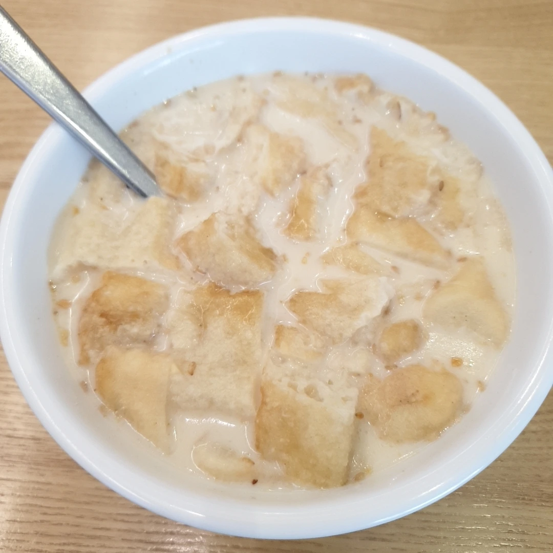 콩 국위에 건더기들을 한 숟가락 떠서 입으로 넣었다. 쫀득한 식감이 느껴지며 국물의 고소함이 배어져서 새로웠다. 인절미 같기도 꽈배기 같은 정체를 알 수 없는 건더기들에 숟가락질이 빨라졌다.
