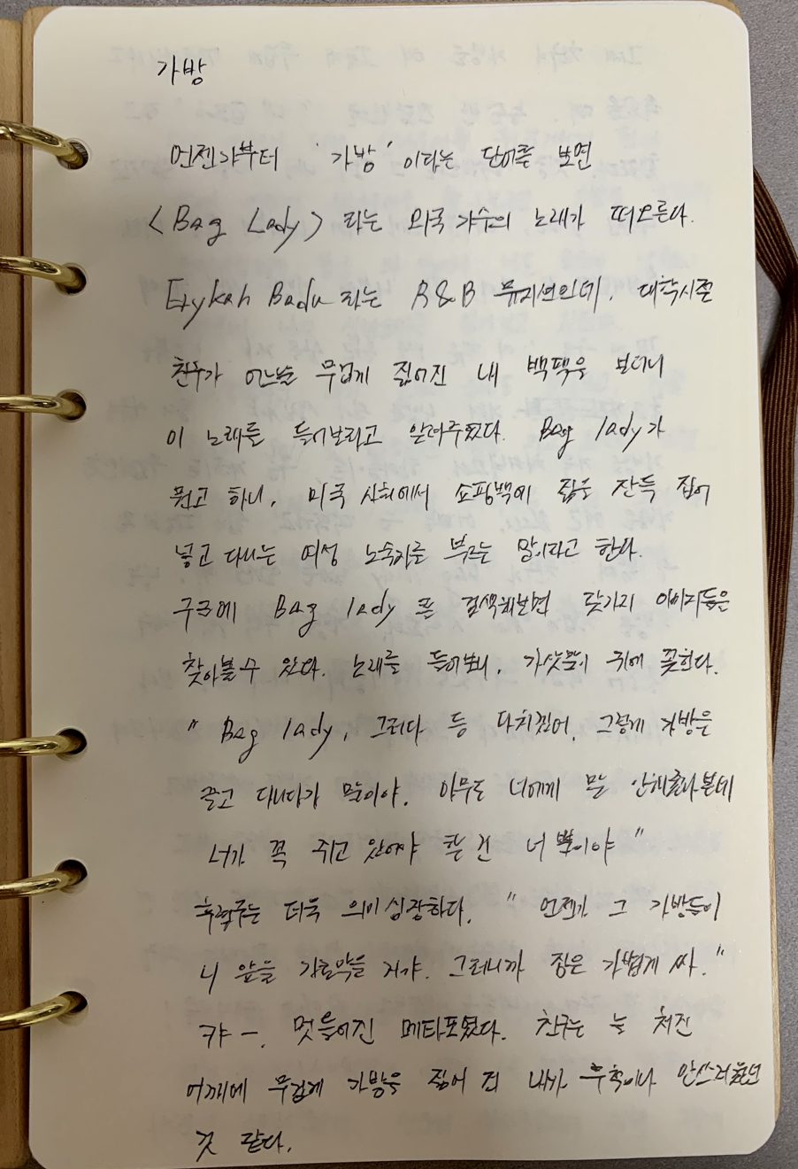 캬. 멋들어진 메타포였다. 친구는 늘 처진 어깨에 무겁게 가방을 짊어진 내가 무척이나 안쓰러웠던 것 같다. 그때 친구가 가방을 왜 그렇게 무겁게 메고 다니냐고 물었을 때, 농담 반 진담 반으로 "내 업보야"라고 했었다. 지금 생각해 보아도 그 당시 내가 가방에 짊어지고 다녔던 것들은, 대부분 내가 미처 내려놓지 못한 미련, 욕심이었던 것 같다. 집을 나설 때 가방을 싸곤 하는데, 그럴 때 '이 책은 오늘 읽고 싶을 거야. 노트북을 놓고 가면 난감한 일이 생길 거야' 등의 이유로 가방을 가득 채워 넣었다. 한여름이든, 추운 겨울이든 무겁기만 한 가방을 메고 있으니, 어깨는 늘 딱딱하고, 쉽게 피로해질 수밖에. 친구가 Bag Lady 노래를 알려준 뒤 나는 가방을 가볍게 싸기 시작했다. 가방을 꾸역꾸역 채워 넣으려는 욕심을 의식적으로 내려놓으며, 나의 삶도 보다 가벼워지기를 바랐다. 그로부터 벌써 5-6년이 지났나 보다. 백팩 대신 숄더백을 들고 다니는 요즘, 가방은 예전보다 가벼워졌지만, 여전히 가끔씩 미어터지는 가방을 보고 왜 또 그랬을까 싶을 때가 있다. 가방을 싸는 건 뭔가를 채우는 게 아니라, 덜어내는 과정인 것 같다. 내일은 오늘보다 light 하기를!