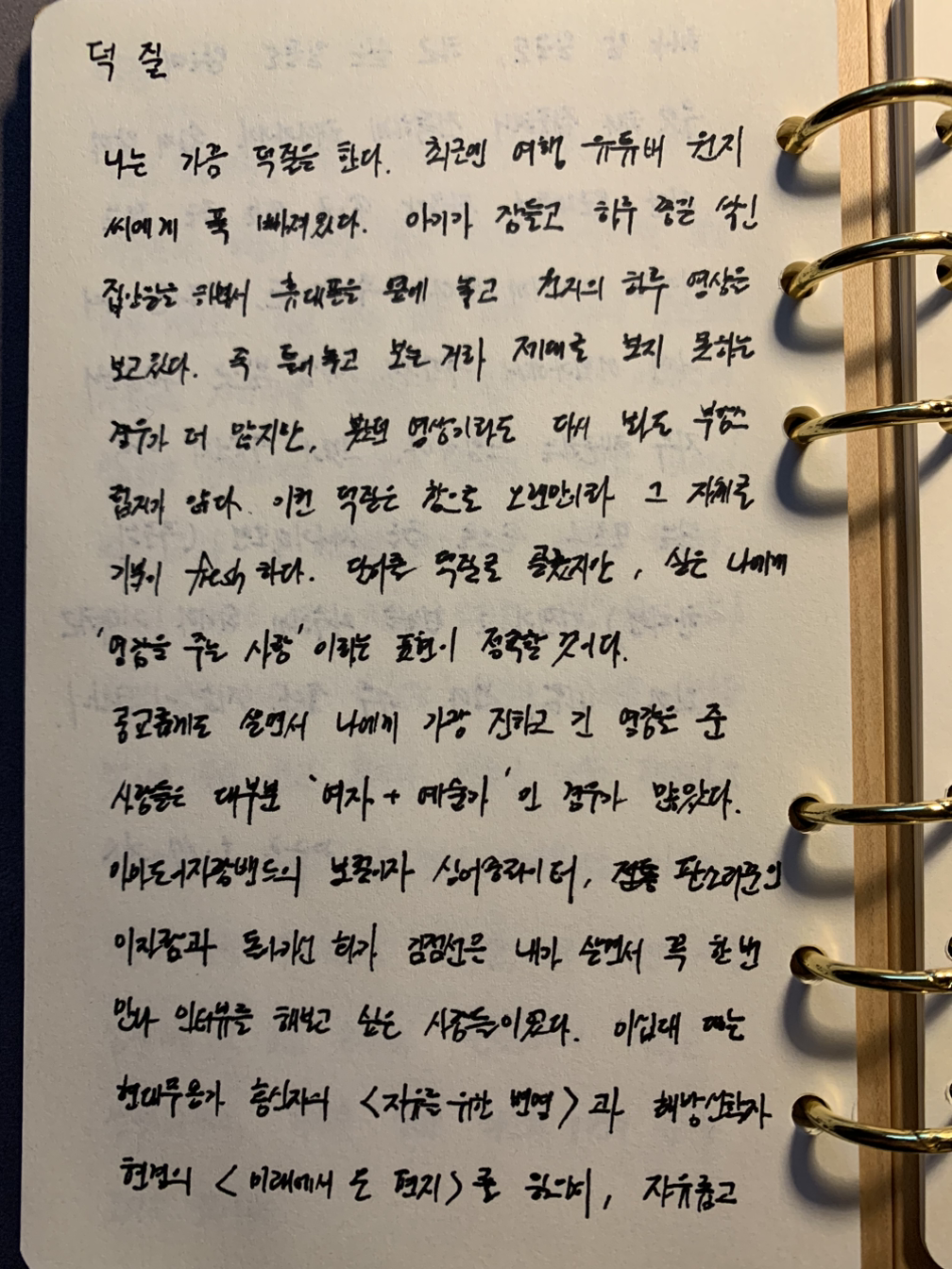 나는 가끔 덕질을 한다. 최근엔 여행 유튜버 원지씨에게 푹 빠져있다. 아기가 잠들고 하루 종일 쌓인 집안일을 하면서 휴대폰을 옆에 놓고 <원지의 하루> 영상을 보고 있다. 쭉 틀어놓고 흘끔거리며 듣는 거라 제대로 보지 못하는 경우가 더 많지만, 봤던 영상이라도 다시 봐도 부담스럽지가 않다. 이런 덕질은 참으로 오랜만이라. 그 자체로 기분이 fresh 하다. 단어를 덕질로 골랐지만, 실은 나에게 '영감을 주는 사람'이라는 표현이 정확할 것이다.