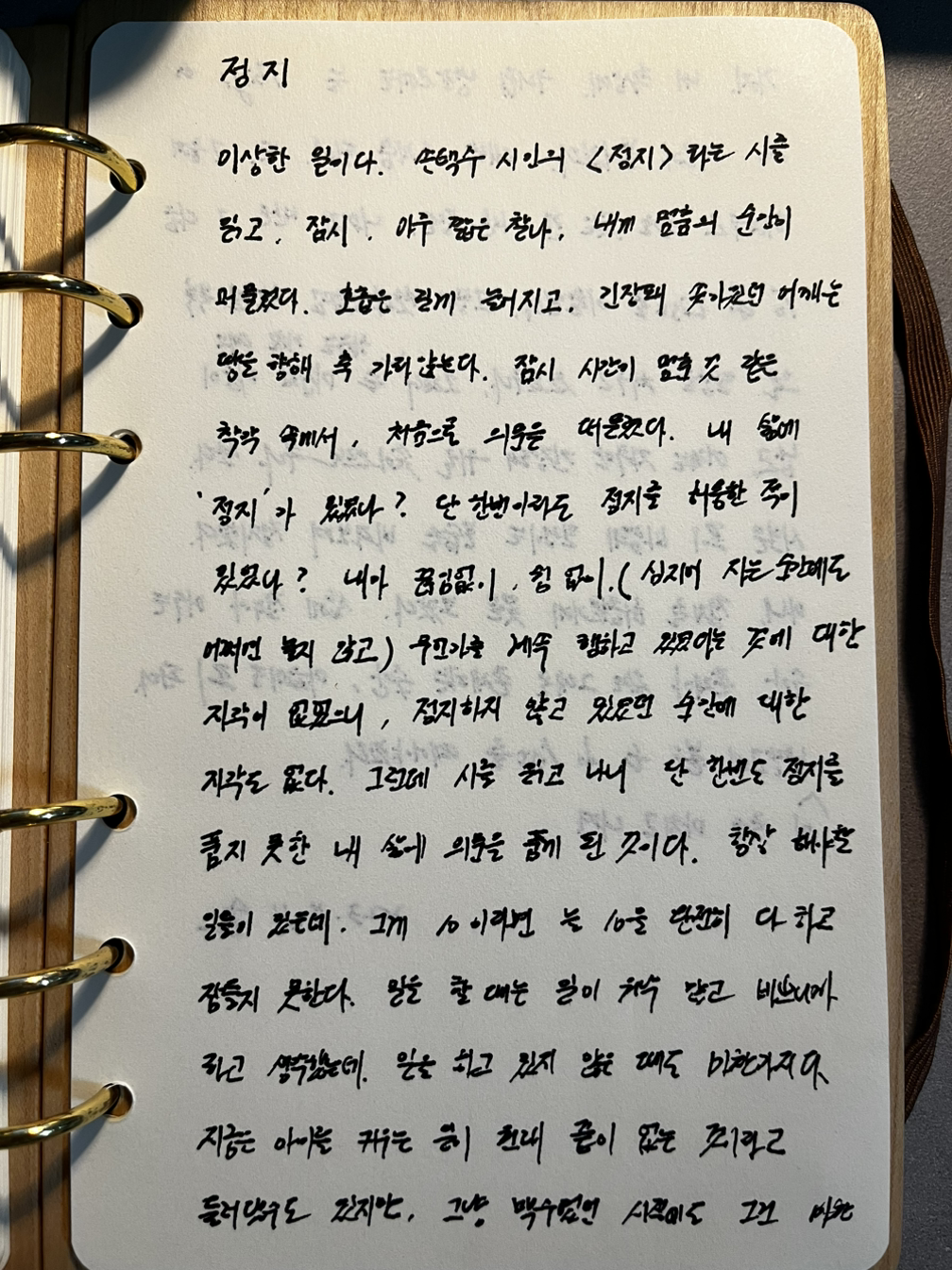 내가 끊임없이, 쉼 없이(심지어 자고 있는 순간에도 어쩌면 놓지 않고) 무언가를 계속 행하고 있었다는 것에 대한 자각이 없으니, 정지하지 않고 있었다는 것에 대한 자각도 없다. 그런데 시를 읽고 나니 단 한 번도 정지를 품지 못한 내 삶에 자그마한 의문의 파문이 일었다.