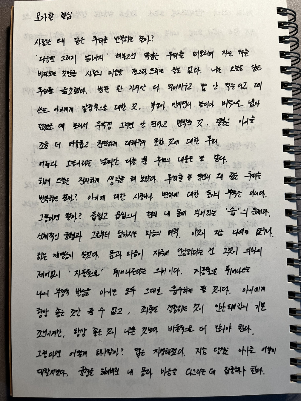 하여 오늘은 고요 속에 진지하게 생각을 해보았다. 후회할 걸 알면서 같은 후회를 왜 반복하는 걸까? 아이에 대한 사랑이나 변화에 대한 동기의 부족은 아니다. 그렇다면 뭘까? 곱씹고 곱씹으니 현재 내 몸에 익어있는 ‘습’의 문제다. 신체적인 균형과 그로부터 담아지는 마음의 여력. 이것이 지금 나에게 없구나, 그러니 크고 작은 여러 자극에 민감할 수밖에 없구나, 하는 깨달음이 일었다.