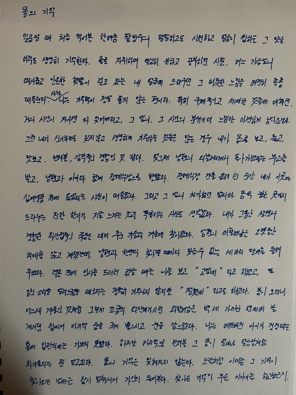 나는 예민해진 아이가 징징대는 통에 민폐가 될까봐 입관식에는 가보지 못했다. 하지만 마지막으로 만져볼 그 몸이 얼마나 얼음장처럼 차가울지는 잘 알고 있다. 몸의 기억은 잘 잊히지 않는다. 오늘처럼 이따금 그 기억이 찾아오는 날에는 잠시 멈춰 서서 가만히 들어본다. 찾아온 기억이 오늘은 무슨 이야기를 하고 싶은지.