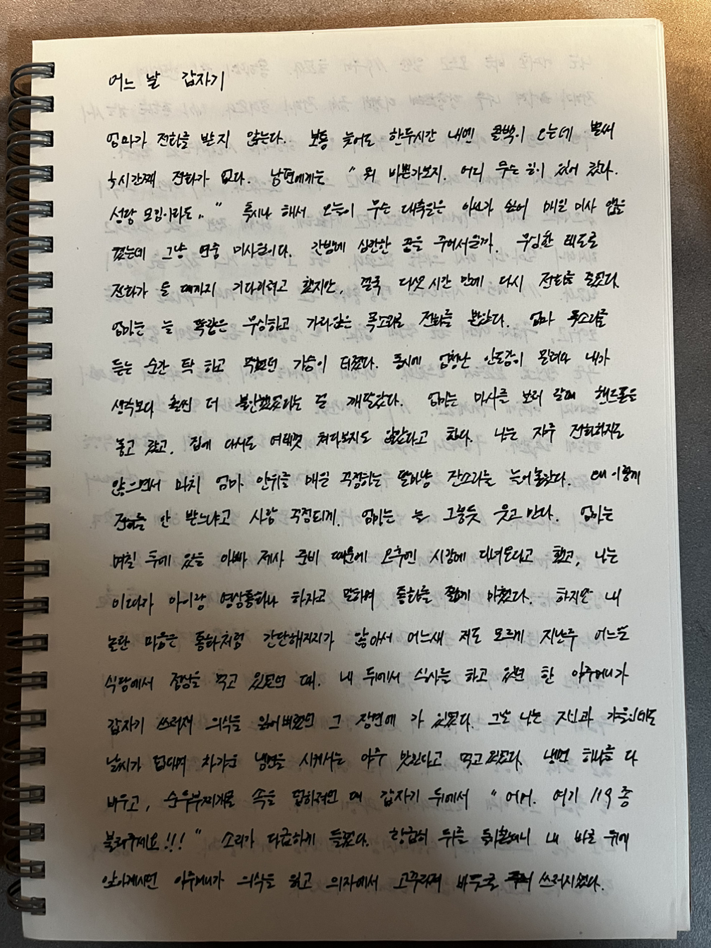 그날 나는 지인과 가을인데도 날씨가 덥다며 차가운 냉면을 시켜서는 아주 맛있다고 먹고 있었다. 냉면 하나를 다 비우고 순두부찌개로 속을 덥히려던 때. 갑자기 뒤에서 "어머머머 여기 119 좀 불러주세요!!!" 소리가 다급하게 들렸다. 황급히 뒤를 돌아보니 내 바로 뒤에 앉아계셨던 아주머니가 의식을 잃고 의자에서 고꾸라져 바닥으로 쓰러졌다.