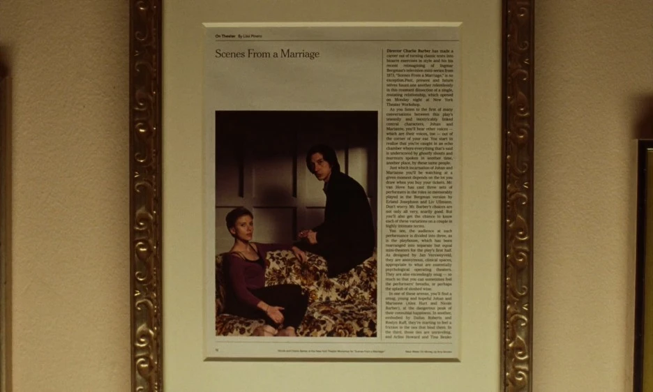 여기서 노아 바움백은 ‘남편’과 ‘아내’라는 역할에 주목한다. 마치 잉마르 베리만의 <결혼의 풍경(Scenes From A Marriage,1973)>을 연상 게하는 결혼의 파멸을 그릴 연극무대를 세운다. 초반부에는 남녀가 카메라 숏에 함께 잡히지만, 점차 벽과 기둥을 분기점으로 남자 따로, 여자 따로 각각 잡힌다. 결혼이라는 법적 서약이 해체되는 과정을 그린다.