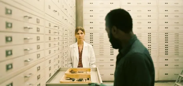 프리포트에서 닐(로버트 패틴슨) 과의 대화, 탈린에서의 프리야(딤플 카파디아)와의 대화 등으로 상황을 정리해 주고, 다음 장소로 이동한다. 이처럼 놀란의 서사는 ’오페라극장-프리프트-스탈스크’ 구체적인 지명으로 수렴된다. 컷이 복잡하고, 여러 시간대의 동일 인물이 같은 시간대에 등장해서 어렵게 느껴질 뿐이지, 놀란은 ‘사건의 결과’를 항상 정리해 주고 그 사건의 결과에서 다음 사건의 결과로 이어지는 일직선으로 나아간다. 또한 <인셉션>에 토템이 있듯이 <테넷>에는 대량 살상무기 ‘알고리즘’이 물체로 등장시켜 이것이 환상이 아님을 확인시켜준다.
