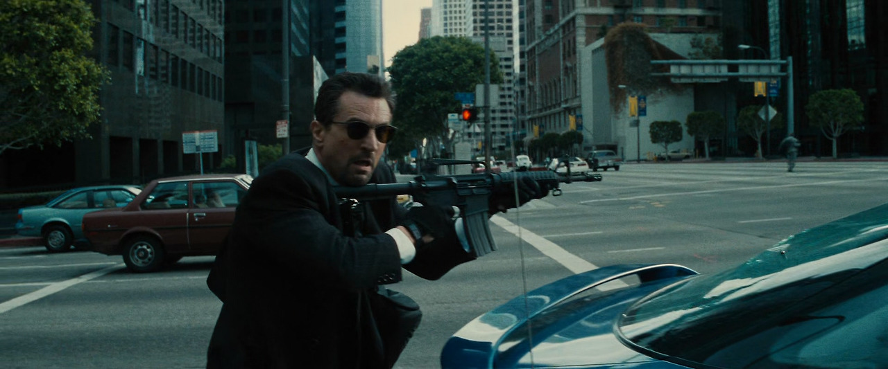 두 위대한 배우는 식당에서 전설적인 일대일 장면에서 절정을 이른다. 단 10여 분간 함께 대화를 나눌 때, 동전의 양면처럼 불처럼 취조하는 파치노에 맞서 드니로는 물처럼 유유자적하게 묵비권을 행사한다. 그 계산된 침묵은, 그를 진중하게 보여준다. 그는 항상 남보다 한수 앞을 내다보고 있으며, 결코 포기할 줄 모르는 신념을 지녔다.