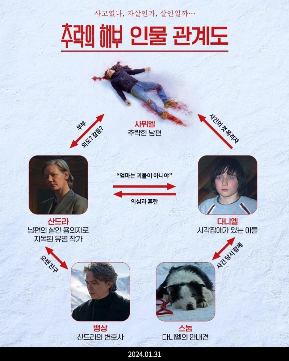 [줄거리] 남편의 추락사로 한순간에 유력한 용의자로 지목된 유명 작가 ‘산드라 보이터(산드라 휠러)’. 유일한 목격자는 시각장애를 지닌 아들 ‘다니엘(밀로 마차도 그라너)’과 안내견뿐. 단순한 사고였을까? 아니면 우발적 자살 혹은 의도된 살인?
