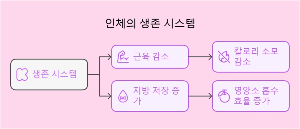 이러한 생존 시스템 덕분에 몸은 영양소가 부족하다고 느끼면 근육을 줄이고 지방을 더욱 쉽게 축적하는 방향으로 적응한다.