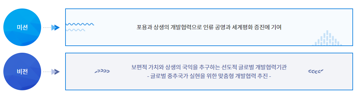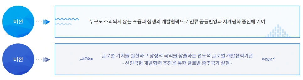 일전의 코이카의 미션은 코이카에 관심 있는 분이라면 알고 있는 "누구도 소외되지 않는 포용과 상생의 개발협력으로 인류공동번영과 세계화의 기여"입니다. 개인적으로는 좀 더 짧게 만들어 한국형 ODA의 특징을 잘 살리면 좋겠지만 개발협력의 가치를 잘 담고 있는 듯했습니다. (참고: Leave no one left Behind(LNOB)는 SDG의 캐치프레이즈 중 하나입니다.) 지금은 '누구도 소외받지 않는'을 빼고 한국형 ODA의 방향을 조금 더 담으려고 노력하는 듯했습니다.