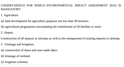 가나도 의외로 환경에 신경을 많이 쓰는 국가 중 하나입니다. 가나 환경부에서 따른 관련 법령(Ghana's Environmental Assessment Regulations, LI 1652)에 따라 Irrigtaion 사업의 경우 환경영향평가(Environmental Impact Assessment, EIA)를 진행해야 합니다.