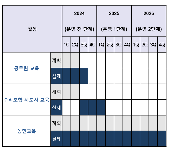 교육 시기와 관련하여, 앞선 선순환 구조와 달리 기존의 사업 요청서와 제안서에는 세 개의 수혜자를 대상으로 하는 프로그램이 동시에 시작되는 청사진이 제시되었습니다. 이에 해당 계획대로 진행을 하게 되면 코이카에서 요청하는 그림이 안 만들어지는 상황이었습니다. 이상적으로라면 공무원들이 교육을 받은 이후에 그 기술을 직접 교육하겠지만, 실상은 정부 예산이 없어 공무원들이 수리조합 지도자들을 교육하는 프로그램 자체가 없었기 때문입니다.