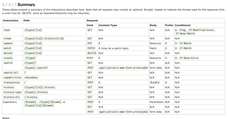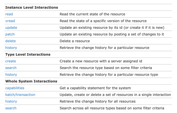 앞서 말씀드렸듯이, 현재 FHIR은 기존보다 더욱 유연하게 자원을 관리하고 확장하기 위한 특징을 가졌는데요, 이를 위해 FHIR 서비스는 모두 기본적으로 REST 방식을 기반으로 이루어집니다. 이때 REST란 우리가 현재 자주 사용하고 있는 HTTP, 즉 웹 기반의 통신을 통해 CRUD(Create, Receive, Update, Delete)를 실행하는 것으로, 의미 그대로 어떠한 자원을 웹과의 통신을 기반으로 생성, 조회, 수정, 삭제하는 것을 뜻합니다. 즉, 웹 클라이언트가 웹서버로 API 요청과 응답을 주고받는 것과 비슷하게, FHIR을 사용하는 클라이언트(모바일 앱, 포털, 웹)들의 API를 FHIR 서버가 처리하여 응답하는 것이 기본 동작 방식이라고 말할 수 있습니다. 따라서, 특정 의료 정보에 대한 문서 ‘자원’ 즉 리소스는 설계된 리소스 요청 구조를 기반으로 CRUD 동작을 통해 쉽게 생성, 관리가 가능합니다.