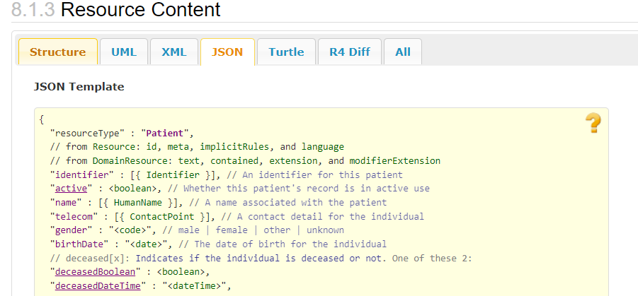 예로, 아래의 이미지는 환자의 건강 관련 활동 데이터를 다루는 'Patient' 리소스의 JSON형식 구조입니다.