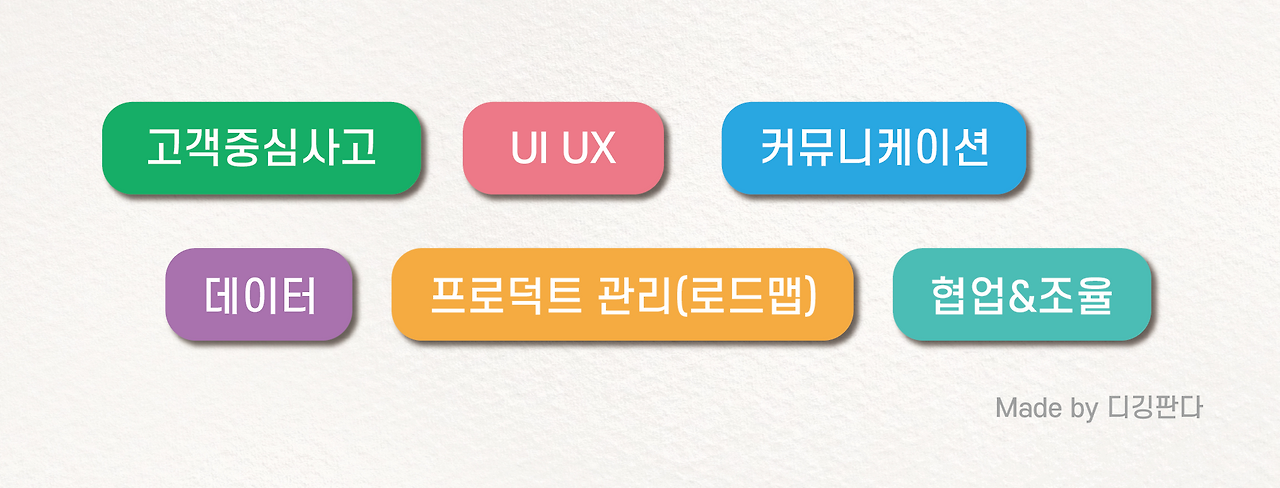 이를 한눈에 보기 쉽게 정리해 보자면 고객중심사고, UI UX, 커뮤니케이션, 데이터, 프로덕트 관리, 협업과 조율 이라는 키워드로 정리해 볼 수 있을 것 같다. 즉,