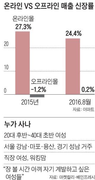 또한 육아 이외의 자신의 시간을 통해 재충전을 원하는 경향이 높다. 실제로 하단 우측 통계자료와 같이 온라인 오프라인 매출 신장률 비교에 있어서도 장 보는 시간은 육아 이외의 재충전의 시간을 원하는 부모들에게 심리적 부담이 되어 온라인 몰에서 식료품을 구매하는 원인이 되고 있다.