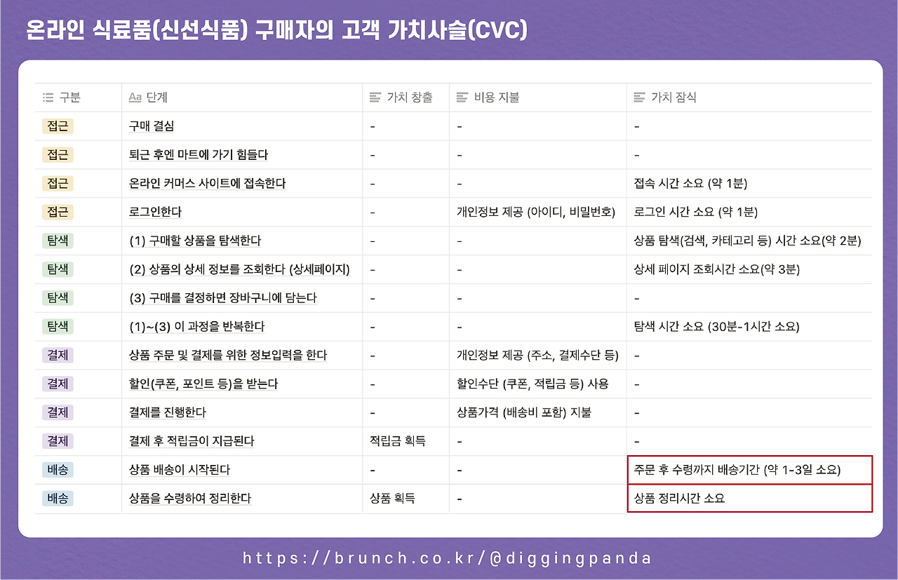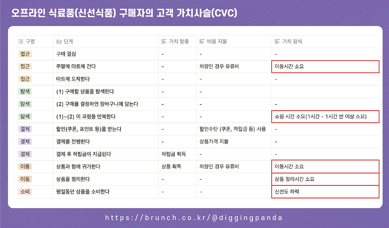 마켓컬리가 서비스되기 이전 퍼소나 해당 고객들의 고객 가치 사슬(CVC)을 통해 분석해 보자