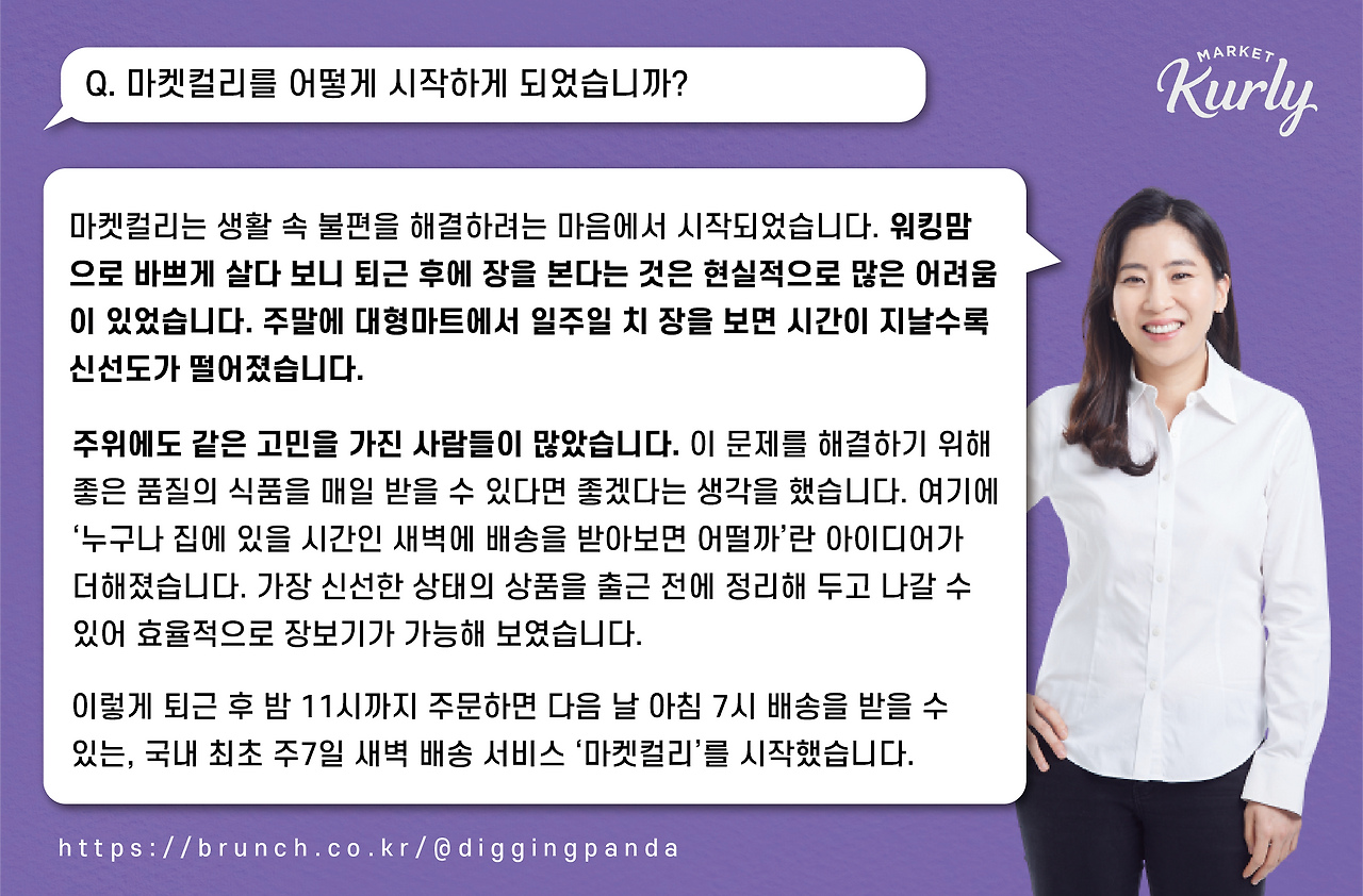 그런 마켓컬리의 초기 퍼소나는 종종 소개될 정도로 유명하다. ‘가족들에게 좋은 것만 먹이고 싶지만 바쁜 워킹맘’이 바로 그것이다. 이미 유명해져 많은 사람들이 알다시피 마켓컬리는 '신선함을 문 앞까지'라는 대표 문구처럼 신선식품 새벽 배송으로 대표되는 기업이다.