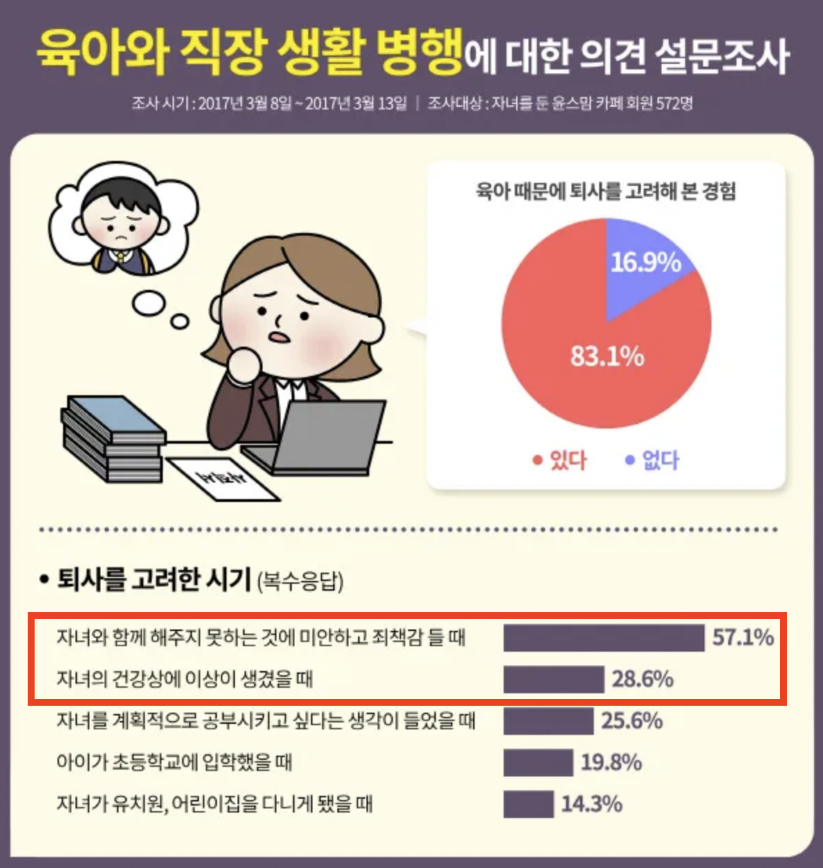 일단 첫 번째 이유로 역시 자녀 건강에 대한 걱정을 꼽을 수 있다. 육아와 직장 생활 병행에 대한 의견 설문조사에 따르면 퇴사를 고려한 시기에는 자녀와의 경험 공유가 적어 미안하고 죄책감이 들 때가 57.1%, 이어서 자녀의 건강상에 이상이 생겼을 때가 28.6% 일 정도로 자녀에게 관심과 건강 걱정이 높다는 것을 알 수 있다. 특히 음식의 경우 자녀의 건강과 직결되는 문제이기 때문에 '신선'하고 '품질' 좋은 식재료를 원할 가능성이 높다.