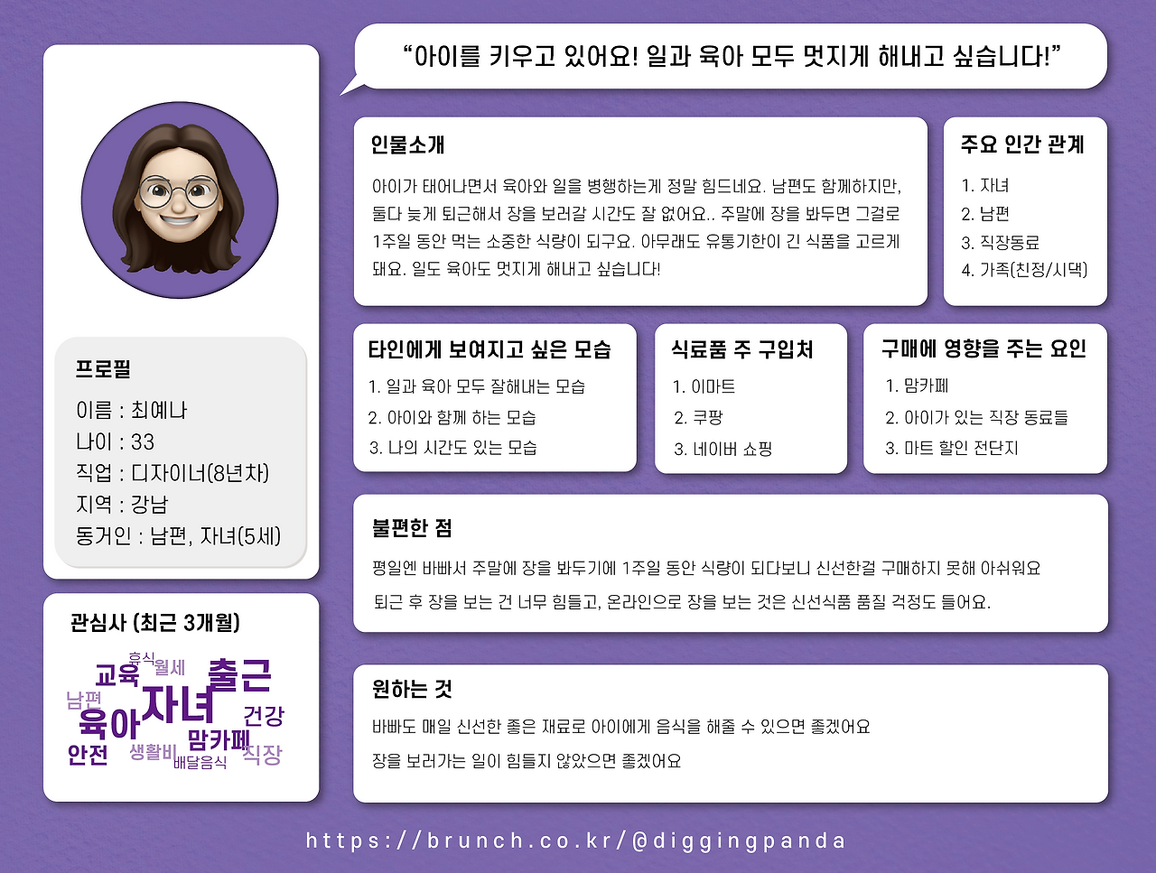위와 같이 워킹맘들의 '자녀 건강에 대한 걱정'과 '체력적, 심리적 고충'은 품질 좋은 식품을 온라인을 통해 신선하게 배달받기를 원하는 이유가 되었다고 보인다. 이에 따라 위의 고충들을 겪을 가상의 인물을 퍼소나로 설정해 보았다.