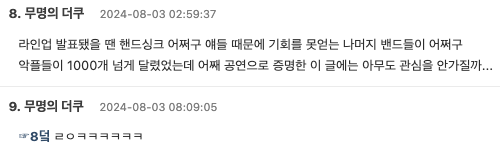 그럼에도, 인기를 떠나서도 바위게가 아닌 대중들한테도 진심이 전해지는 무대였을 거라 확신한다. 더 이상 '아이돌 컨셉 밴드'라 치부하고 무시해 버리기에는 기존에 있던 화제성에 실력까지 입증한 무대였다. QWER의 펜타포트 공연에 대한 반응이 궁금해 살피던 중, 아래와 같이 너무도 공감 가는 댓글을 발견해 공유한다.
