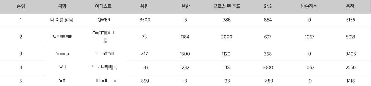 이 결과는 팬들과 함께 만들어낸 것이기에 바위게로서 그 의미가 더 컸다. 아래 최종 결과표를 보면 알 수 있듯이 2위와의 점수 차이가 크지 않았다. 음원 성적은 압도적이었지만 방송 출연이 없어 감점이 컸고, 음반 점수 역시 팬덤 규모가 작아 많이 뒤처졌다. 하지만 많은 바위게들의 노력 덕분에 글로벌 팬 투표에서 격차를 좁힐 수 있었고, 모든 점수를 합산한 결과 종합점수 1위를 거머쥘 수 있었다.