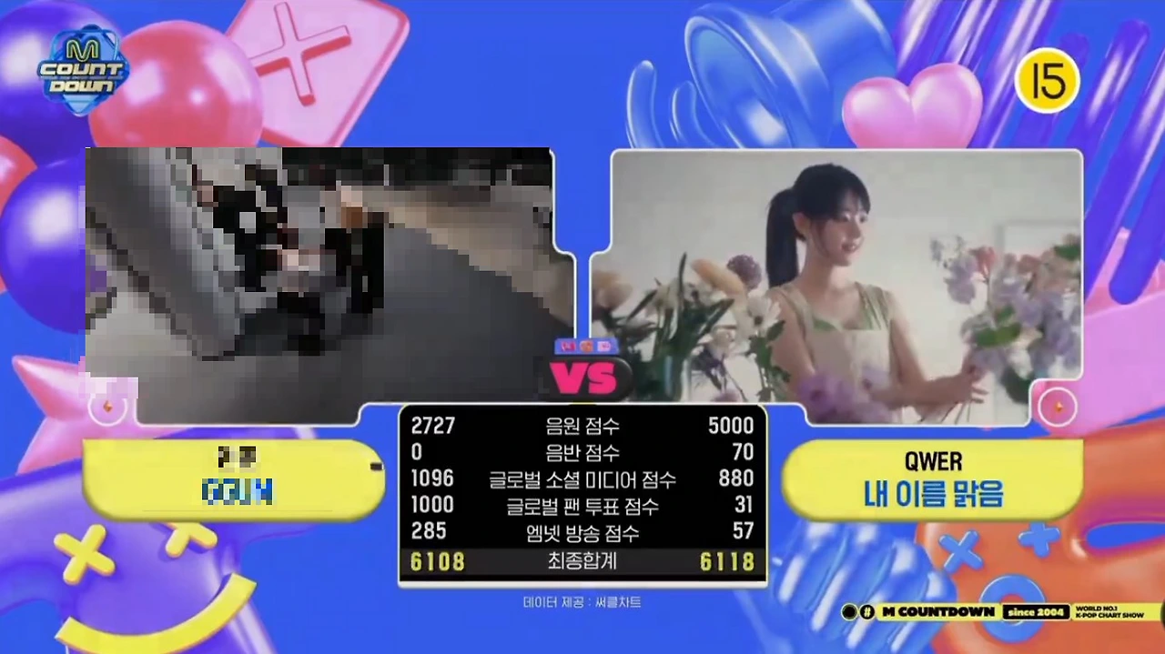 그 결과 아래와 같이, '10점'이라는 근소한 차이로 QWER이 이틀 연속 음악방송 1위, 무려 2관왕을 달성했다. 엠카운트다운은 상대평가인 생방송 투표가 중요하고 아래 표에는 표시되어 있지 않은데, 2등 팀과의 '생방송 투표' 점수 차이는 1,000점(2등 팀) 대 80점(QWER)이었다. 두 줌 단 정도로 진화했다고 자신했지만 상대에 비하면 여전히 귀여운 수준이었다. 비록 1,000점에 비하면 초라해 보여도, 결과적으로 10점 차이였기에 승패를 가른 소중한 80점이라고 볼 수 있다. 이틀 연속으로 바위게 뽕에 취하고 있다.