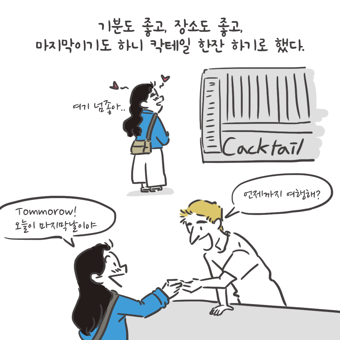 이 평화로움에 취해 칵테일의 술기운이 기분좋게 감돌았다.