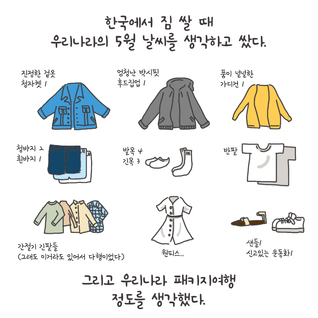 한국의 5월과 비슷한 날씨라 했어서 챙겼던 짐들은