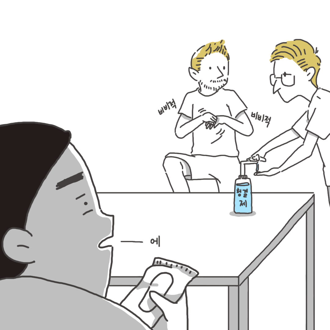 난 당연히 물티슈를 챙겼고, 얘네는 손청결제로 손을 씻더라.