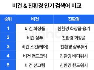 '비건' 뷰티 제품은 '화장품'과 가장 많이 조합되었으며, '스킨케어'와 '핸드크림', '선크림' 기초 카테고리를 많이 검색했고요. '친환경'은 '화장품 용기' 외에도 '샴푸바' '바디워시'처럼 바디 제품을 많이 탐색한 것으로 나타났습니다.