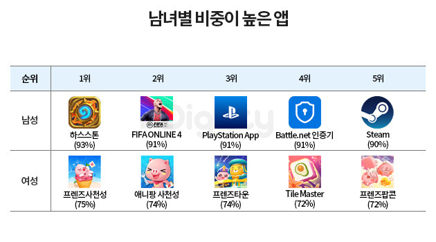 남성 비율이 가장 큰 게임은 블리자드의 '하스스톤'으로 설치자의 93%가 남성이었어요. 또한 블리자드 게임 인증 앱인 'battle.net 인증기'도 91%가 남성으로 4위를 차지했습니다. 남성 비율이 높은 앱의 연령 비중을 보면 대부분 20~30대가 많은데요. 하스스톤(67%)·FIFA ONLINE 4 M(51%)·Steam(62%)는 20대가 절반 이상을 차지했으며, 콘솔게임인 PlayStation App은 30대 비중이 59%로 확인됐습니다.