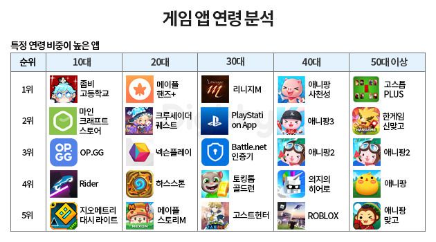 30대에서도 마찬가지로 롤플레잉 게임인 '리니지M'이 67% 비중으로 1위를 차지했고요. 콘솔 게임기 플레이스테이션 앱(59%)이 이어 2위를 차지했습니다. 40대 비율이 높은 앱에서 나란히 1~3위를 차지한 애니팡사천성·애니팡3·애니팡2은 '퍼즐' 앱이었고, 50대 이용자가 많은 앱 상위 5개 중 3개가 고스톱 앱으로 '카드' 카테고리에 속해요.