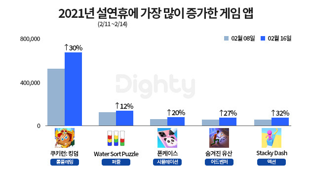 추석 연휴가 아쉽게도 끝이 났는데요. 이번 추석 연휴는 주말과 붙어 있어 5일을 쉴 수 있었지만, 수도권에는 거리두기 4단계가 지속될 예정이라 집에서 보내는 시간이 많았을 것 같아요. 그렇다면 신규 게임을 깔아서 해보는 이용자들도 늘어나기 마련인데요. 올 설 연휴만 봐도 가장 많이 설치된 게임 앱을 보니 설날보다 3주 전에 출시한 '쿠키런:킹덤'이 가장 많이 늘었는데 무려 30%가 증가한 수치였어요. 게임 유저들에게 주목을 받는 출시와 연휴 버프까지 받은 것으로 보여요. 참고로 올 추석 전에는 월드 플리퍼(9/8), 뮤 아크엔젤2(9/9), 택티스 사가(9/15)가 오픈했습니다.
