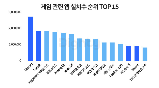 게이머 간에 소통을 하기 위한 필수 앱 '디스코드'가 다른 앱보다 약 100만이 많은 수치로 설치 수 1위에 올랐습니다. 2위는 게임 방송 플랫폼인 '트위치', 3위는 작년 5월 출시 후 고공행진의 인기를 끈 '카트라이더 러쉬 플러스'가 차지했습니다.