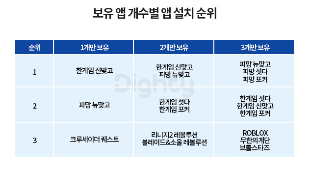 게임 3개만 설치한 유저들은 동일한 회사의 게임들을 함께 설치했는데. 1위는 피망의 '맞고·섯다·포커', 2위는 한게임 '맞고·섯다· 포커'가 차지했습니다. 3위는 '로블록스·무한의계단·브롤스타즈'가 차지했는데 3개 앱 모두 13~18세 비율이 높아, 매칭이 좋은 앱으로 보여요.