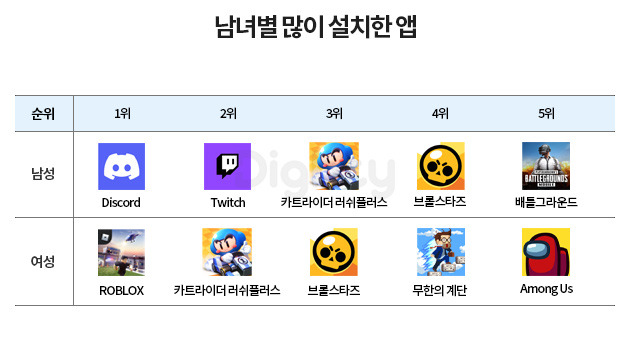남성과 여성이 많이 설치한 게임은 무엇일까요?