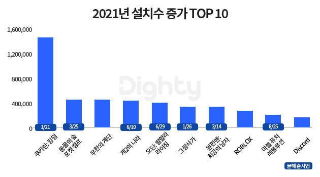 2021년 설치 수가 가장 많이 증가한 앱은 뭐니 뭐니 해도 신규게임이었습니다. 10위 안에 7개 앱이 올해 출시한 게임이었는데요, 그중에서도 RPG로 출시한 데브시스터즈의 신작 '쿠키런:킹덤'이 압도적인 차이로 1위에 올랐습니다. 쿠키런의 특별한 세계관과 탄탄한 성우들의 캐릭터 연기가 인기를 끄는데 한몫했다고 해요.
