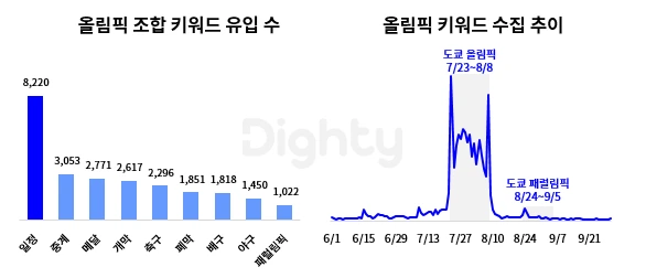 코로나로 1년이 미뤄진 도쿄 올림픽이 올해 7월 23일 개막했는데요. 여러 가지 이슈로 예전처럼 큰 호응이 없을 거라는 예측도 있었으나, 감동할 수밖에 없는 선수들의 투지와 열정에 7, 8월 가장 인기 많은 키워드로 꼽혔습니다. 도쿄 올림픽과 관련된 데이터는 아래에서 더 자세히 다뤘어요!