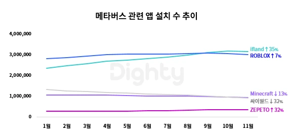 코로나 팬데믹으로 집에서의 생활이 장기화되자, 가상세계인 '메타버스'에 관심과 기대가 커진 2021년이었습니다. 'JUMP VR'에서 'ifland'로 서비스 이름을 바꾼 SKT의 메타버스 앱은 올해 35%의 설치 수 증가율을 보였고요, 여러 브랜드와 아티스트가 활발히 활동하고 있는 '제페토(ZEPETO)'는 32% 증가했어요. 반면에 초등학생 이용자가 많은 '마인크래프트(Minecraft)'는 올해 1월에 비해 13%가 감소해 상반된 추이를 보였어요. 밀레니얼 세대의 메타버스 '싸이월드'는 꾸준하게 감소했지만, 최근 '놀면뭐하니' 방송에서 다시 주목을 받아, 반등할 수 있을지 궁금해지네요 :)