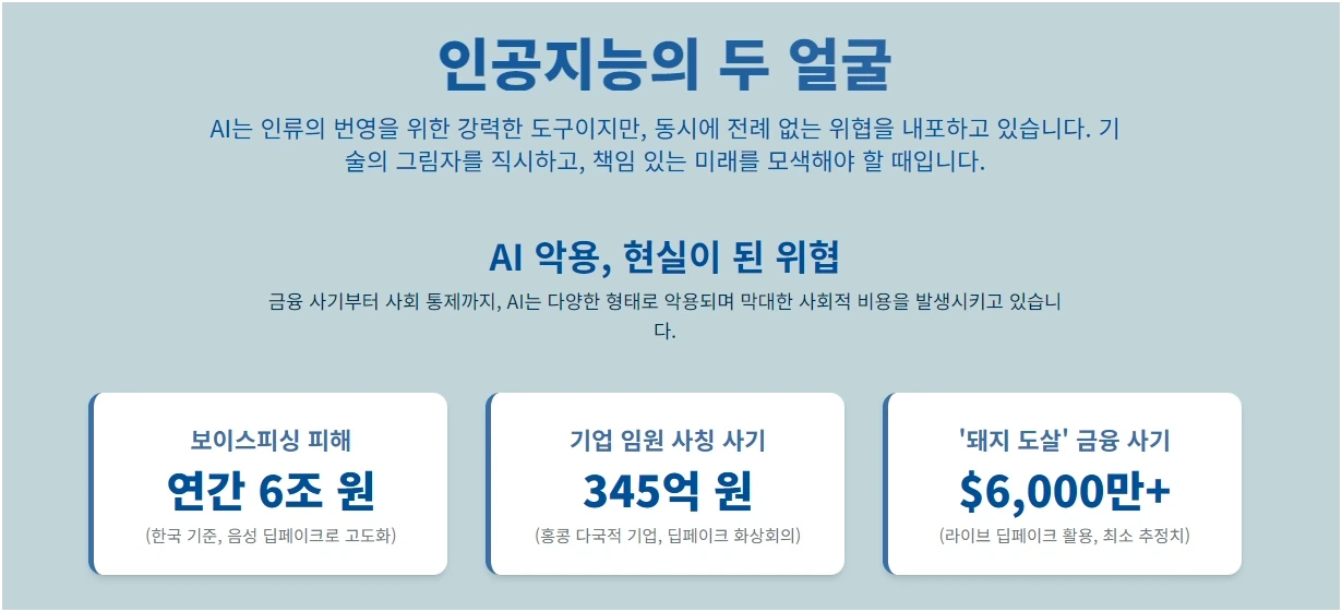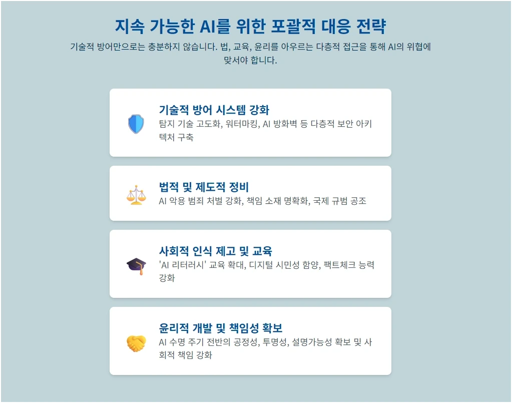 개인 피해: 딥페이크 기술이 개인을 겨냥해 사용될 경우, 그들은 허위 증거에 맞서 싸워야 할 위험이 있습니다. 사회적 신뢰: 이러한 기술이 사회에 퍼지면, 사람들은 온라인에서 본 정보에 대한 신뢰를 잃을 수 있습니다. 대응 기술: 현재 AI 기술을 통해 딥페이크 영상을 탐지하는 방법이 개발되고 있으며, 이는 사회의 신뢰를 유지하는 데 중요한 역할을 합니다.