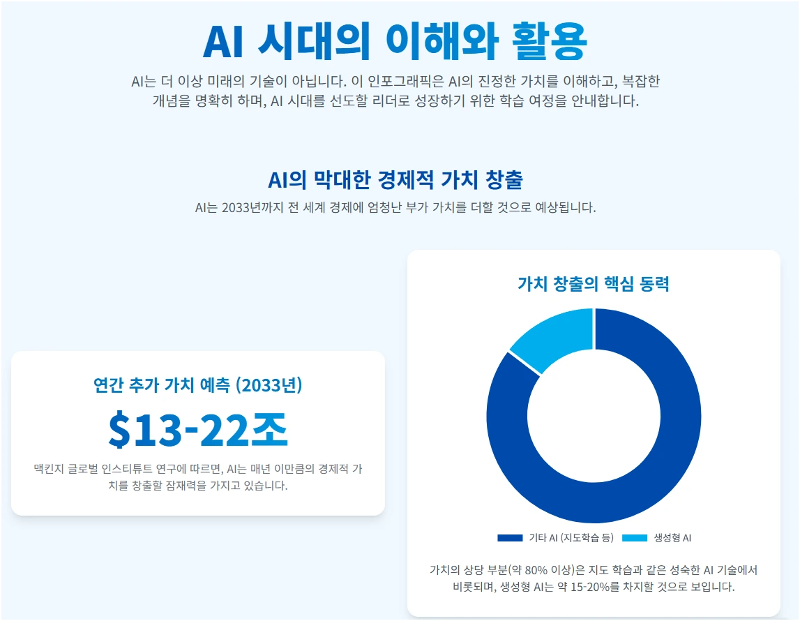 맥킨지 연구에 따르면, 2033년까지 AI는 매년 13조에서 22조 달러의 추가 가치를 창출할 것입니다. 이 중 2조에서 4조 달러는 생성형 AI(Generative AI)에서 나올 것으로 예상됩니다.