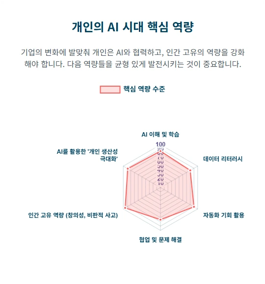 기업이 AI를 잘 활용하기 위해 문화, 프로세스, 의사결정 구조를 변화시켜야 하듯이, 개인 또한 AI 시대에 맞춰 자신의 역할과 역량을 재정의하고 변화해야 합니다. 단순히 AI 도구를 사용하는 것을 넘어, AI가 잘하는 일을 이해하고, AI와 협력하며, AI가 할 수 없는 인간 고유의 역량을 강화하는 것이 중요합니다.
