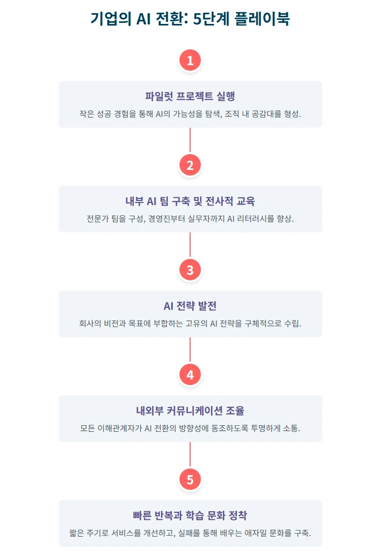 내부 AI 팀 구축 및 광범위한 AI 훈련 제공: 엔지니어뿐 아니라 경영진까지 AI에 대한 이해를 높입니다.