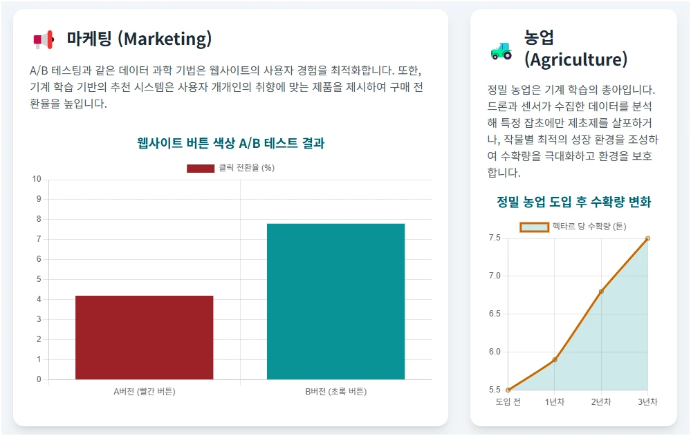 기계 학습: 정밀 농업(예: 잡초 식별 후 정밀 제초제 살포)을 통해 수확량을 증가시키고 환경을 보존.