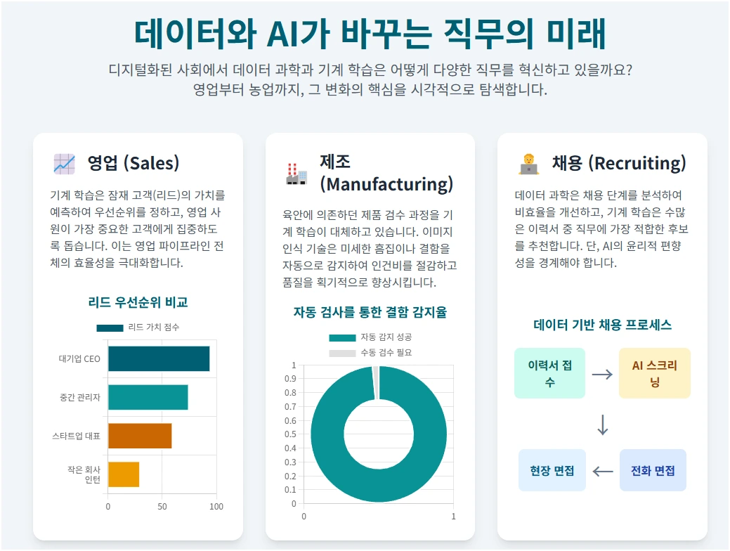 데이터는 채용, 영업, 마케팅, 제조업, 농업 등 다양한 직무 기능을 혁신하고 있습니다. 디지털화된 사회에서 데이터 과학과 기계 학습은 효율성 증대, 비용 절감, 품질 향상, 생산성 극대화에 핵심적인 역할을 합니다.