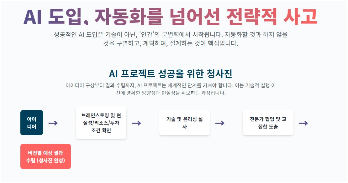 아이디어 → 브레인스토밍 → 현실 가능성 판단 → 현실화 실제 리소스 확인 → 투자 조건 확인 (시간, 비용 등) → 기술 실사 → 업체 혹은 업무의 충분한 이해와 실사 → AI 전문가와 경영 전문가의 교집합 도출 → 버전별 예상 도출 결과 수립 (청사진)