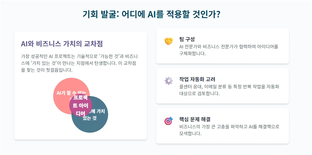 AI가 할 수 있는 것과 비즈니스에 가치 있는 것의 교차점을 찾아보세요. 이 두 가지가 만나는 지점에서 프로젝트 아이디어가 나올 수 있습니다.