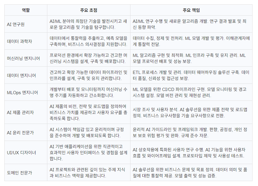 AI 팀의 핵심 역할과 그들의 주요 책임을 간략하게 요약하여, 각 역할의 주요 목표와 기여를 한눈에 파악할 수 있도록 돕습니다.
